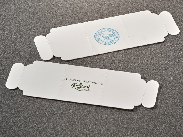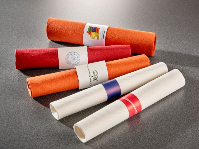 Printed paper napkin bands or paper napkin rings are a simple way of enhancing table presentation. They promote your brand in high quality custom print whilst keeping the napkin neatly rolled.