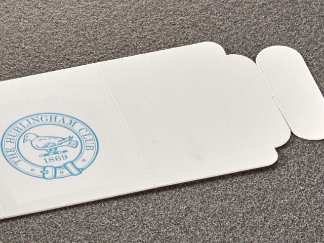 Our 173 x 60mm napkin bands are made from heavyweight 250gsm glossy white card. Simply roll up a linen or airlaid paper napkin, place the napkin band across the roll then secure by fastening the slits at either end of the band together. Glossy card napkin bands can be custom printed with designs in 1,2,3 or 4 spot colours. A minimum print run of 5,000 pieces (1 case) applies.
