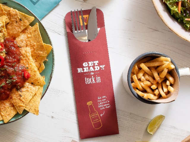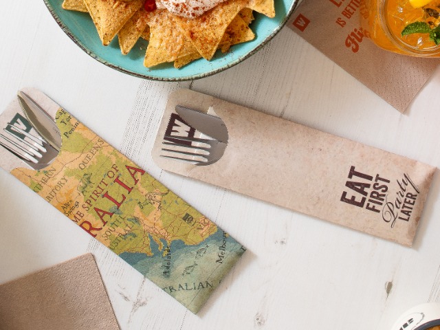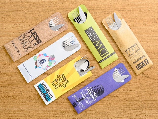 The paper sleeves can be customised with a full colour design – turning them into an effective table top marketing tool, in addition to being a functional cutlery and napkin holder.
