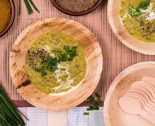 Produced in India, Palm Leaf plates and platters are made from discarded leaves from the Adaka nut palm. The leaves are collected, cleaned and then mechanically pressed in a mould at 120°C; no additional