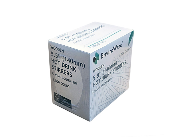 5.5” Wooden Stirrers – supplied in a dispenser box. EnviroWare® 140mm long wooden coffee stirrers – perfect for use with smaller 8oz takeaway hot drink cups or with regular sized tea cups.