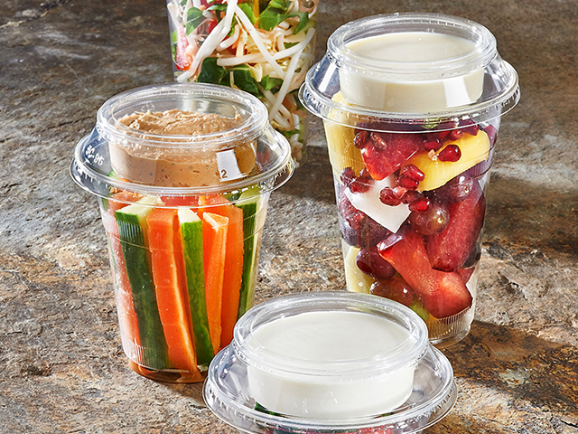 Clear PLA Raised Lids for Enviroware PLA Combination Cups and Pots. This flat lid fits on top of the 2oz portion pot (code R60Y) and clips onto Enviroware 96mm diameter PLA Cold Drink Cups (9, 12 & 16oz PLA Cups available).