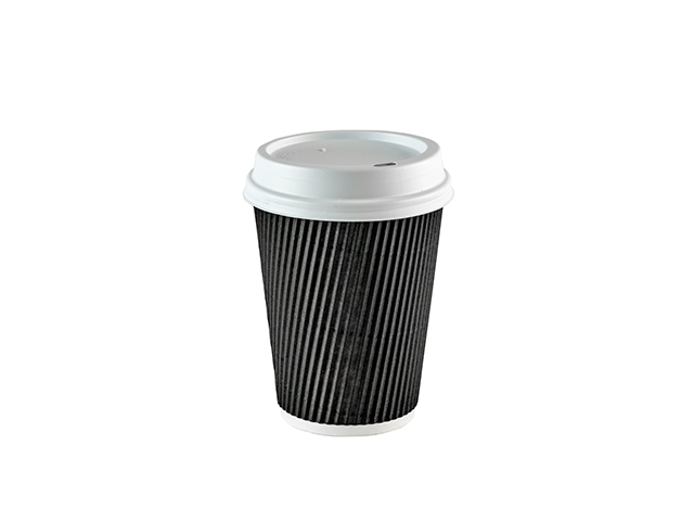 12oz black ripple wall hot drink cups have a black corrugated outer, with a white inner. Lined with a PE plastic film to prevent leaks. Secure fitting white plastic sipper dome lids are available separately.
