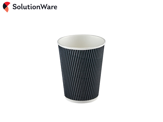 12oz Black Ripple Wall Paper Hot Cups. Quality medium paper cups for takeaway hot drinks, such as tea and coffee. Ripple wrap outer layer provides hand comfort, and provides insulation to keep drinks hot.
