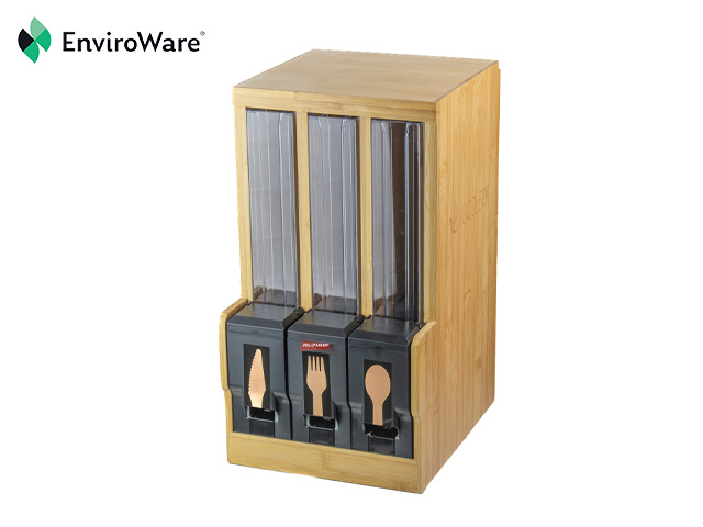 Includes 1 x Bamboo Dispenser for Wooden Cutlery (WDB), 1 x Plastic Cartridge for Regular Wooden Forks (WDRCF), 1 x Plastic Cartridge for Regular Wooden Knives (WDRCK) and 1 x Plastic Cartridge for Regular Wooden Spoons (WDRCS).
