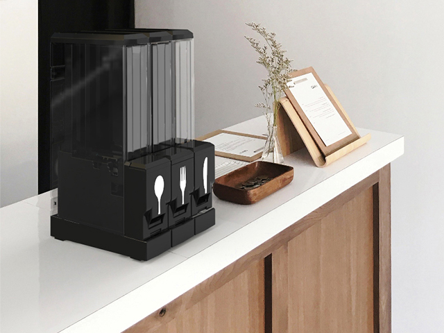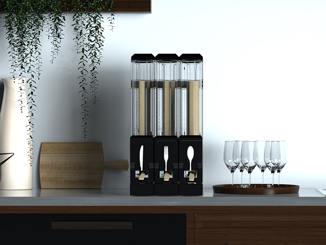 Wooden Cutlery Dispensers filled with premium wooden single-use cutlery – the world’s most hygienic zero touch dispenser. Users have zero contact with the cutlery when filling or using the dispenser. There are no levers or buttons to press – simply pull the cutlery handle from the dispenser.