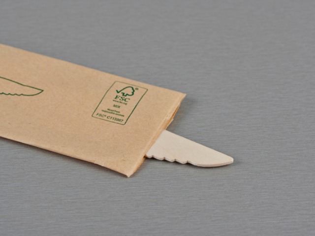 165mm Wrapped Wooden Knives – Standard. EnviroWare® disposable wooden knives, supplied individually wrapped in a paper packet. Made from 100% natural, FSC certified (Forest Stewardship Council) birch wood; a sustainable replacement for disposable plastic knives. Our disposable knives are sturdy with a serrated edge for cutting through foods.