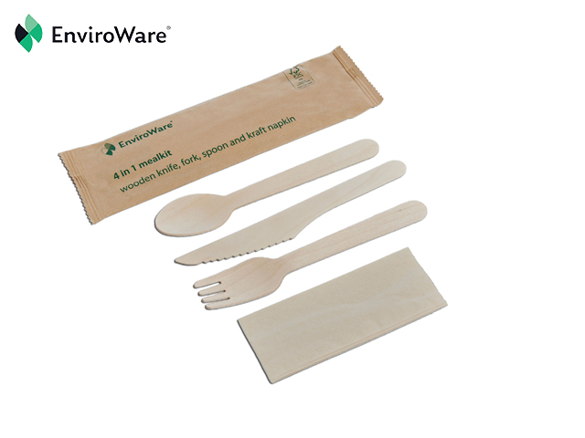 4 in 1 Wooden Meal kits – Knife, Fork, Spoon, Napkin. EnviroWare® disposable wooden cutlery mealkits. Each 4-in-1 meal kit contains a single-use wooden knife, fork, spoon and a 22cm square brown paper napkin. All items, including the unbleached paper wrapping, are plastic-free. The wooden cutlery is certified by FSC (Forest Stewardship Council), this means that the wood is sourced from sustainable forests. Supplied in cases of 500 meal kit packs. Mealkits are perfect for grab and go lunch boxes.