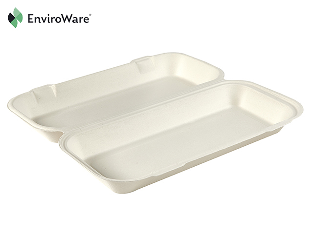 13 x 6″ White Bagasse Extra Long Clamshells. EnviroWare® bagasse fish & chip boxes.