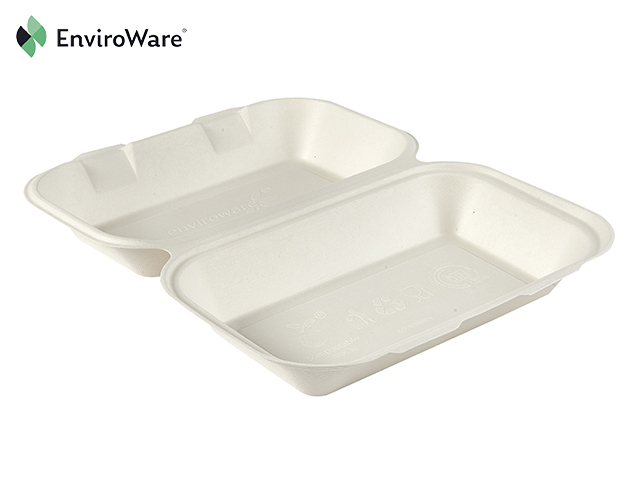 9.5 x 6″ White Bagasse Large Clamshells. EnviroWare® large rectangular hinged food boxes.