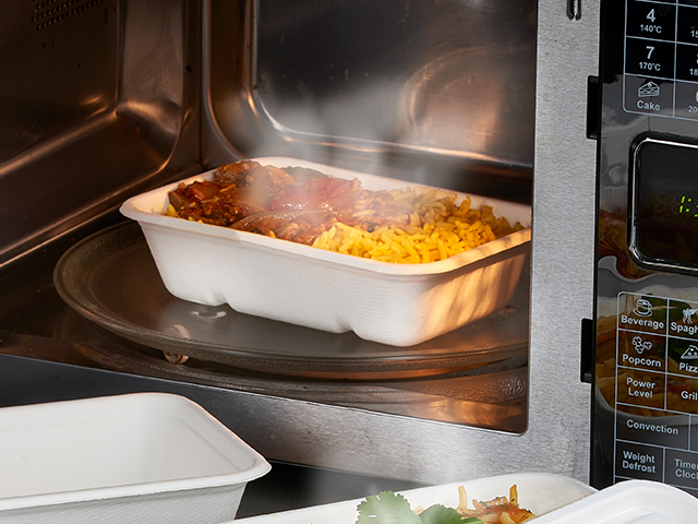 550ml Leakproof Bagasse Trays and matching lids are designed to be stackable and they are suitable for microwave reheating foods.