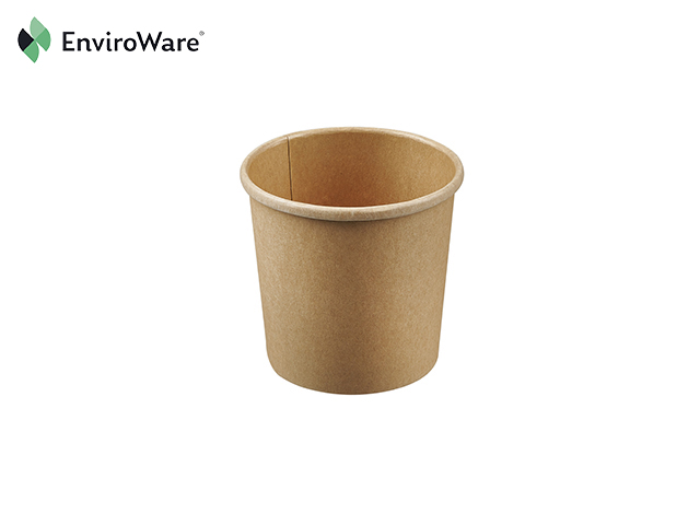 12oz Kraft PLA Lined Soup Containers (341ml). Made from thick natural brown coloured paper with a PLA (plant starch) lining. Certified commercially compostable (DIN EN 13432:2000-12).