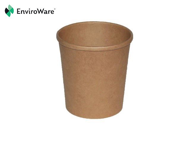 32oz Kraft PLA Lined Soup Containers (946ml). Made from thick natural brown coloured kraft paper board with a PLA (plant starch) lining. Certified commercially compostable (DIN EN 13432:2000-12).
