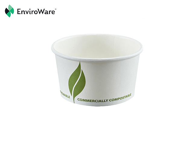The EnviroWare® Leaf 2 design is white with green print, including the words “sustainable, renewable, commercially compostable”.