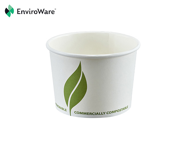 The EnviroWare® Leaf 2 design is white with green print, including the words “sustainable, renewable, commercially compostable”.