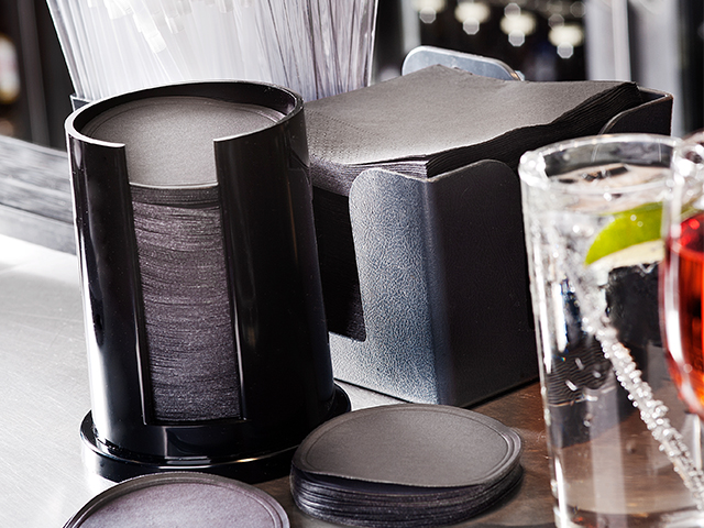 Made from absorbent multiply black tissue paper with a 1-ply white wax paper backing. A wax paper backing prevents moisture seeping through the tissue coasters. Our Plain black tissue coasters are designed to soak up drips and spills from drinks glasses, therefore protecting the tabletop beneath.