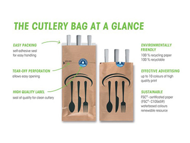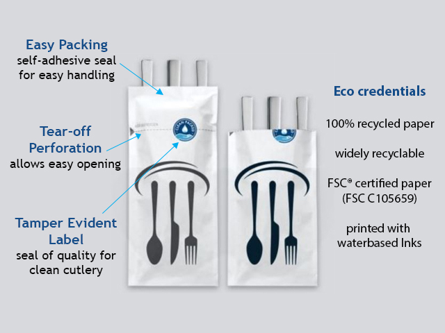 Made from 100% recycled paper, which is recyclable after use. White cutlery bags are certified by FSC® (Forest Stewardship Council®) as coming from sustainable sources. Printed in water-based ink, the stock design shows a simple cutlery motif. The generic design is perfect for use in a wide range of settings, including restaurants, hotels, hospitals, care homes and canteens.
