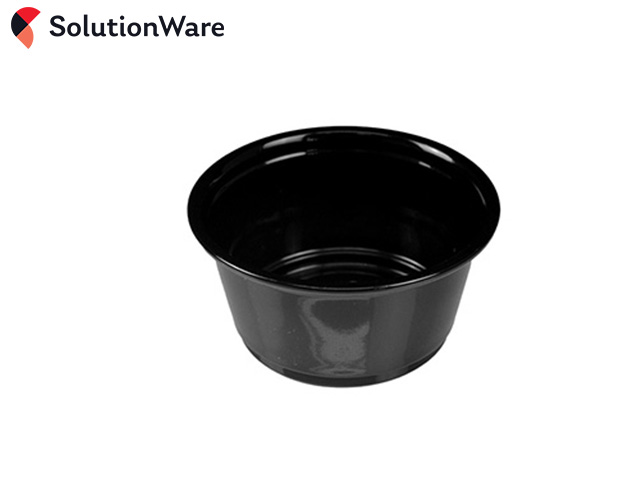 2oz Black PP Portion Pots (43ml). These small black plastic pots can be used for holding sauces, ketchup and dressings. They can also be used as sample cups. Dimensions are 62 mm diameter, 30 mm deep.