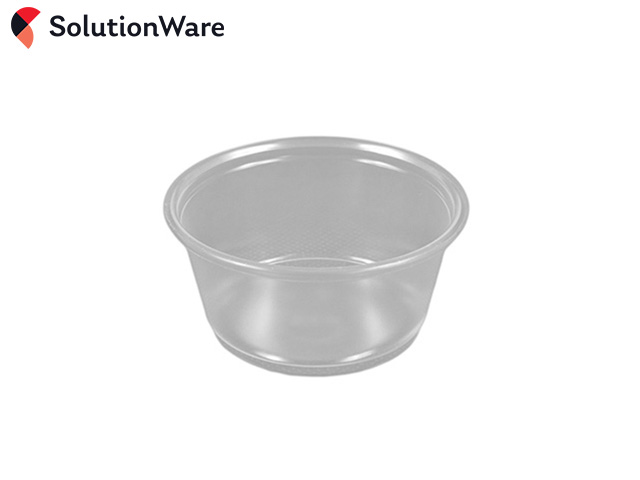 3.25oz Translucent PP Portion Pots, made from polypropylene (91ml capacity). These small semi-clear / translucent plastic pots can be used for holding sauces, ketchup and dressings. They can also be used as sample cups. Dimensions are 74 mm diameter, 35 mm deep.