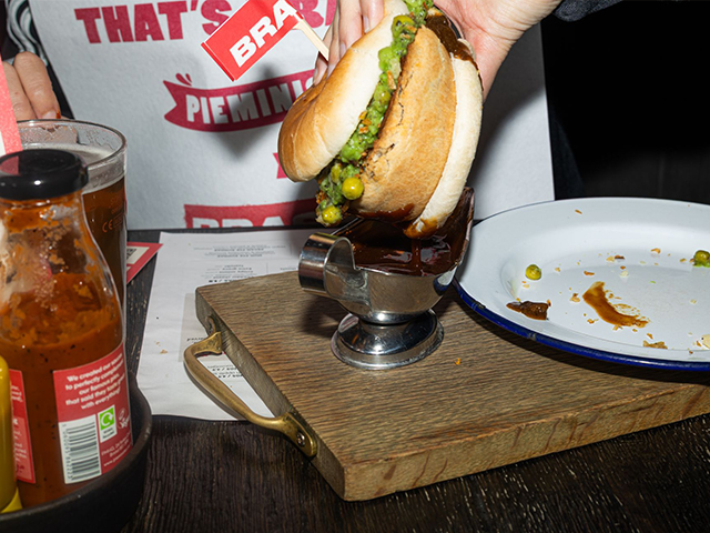 The Brassic is Pieminister’s tongue-in-cheek tribute to the iconic Wigan Kebab — a pie served in a white barm, piled high with mushy peas, cheddar crumb, crispy onions, and drenched in gravy. Deliciously chaotic, just like the show itself!