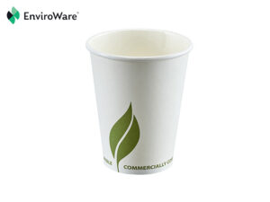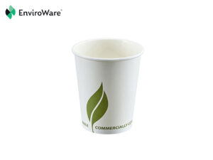 EnviroWare® single wall cups are lined with PLA (plant starch) making them commercially compostable. Certified by Din Certco, with the seedling logo present on the white stock design.